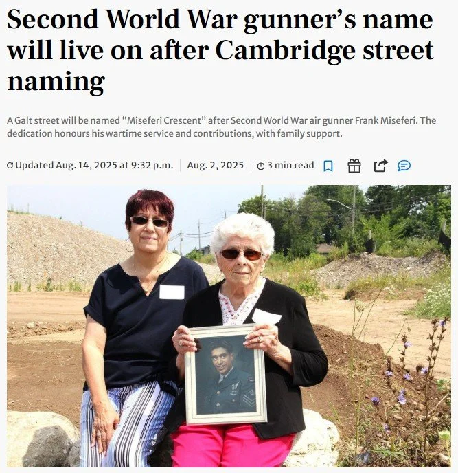 Frank Miseferi, a Second World War air gunner from Galt, will be honoured through the naming of Miseferi Crescent, a new street that will permanently recognize his contribution. The dedication reflects Frank’s service, his connection to the community, and the determination of his family to see his story preserved.